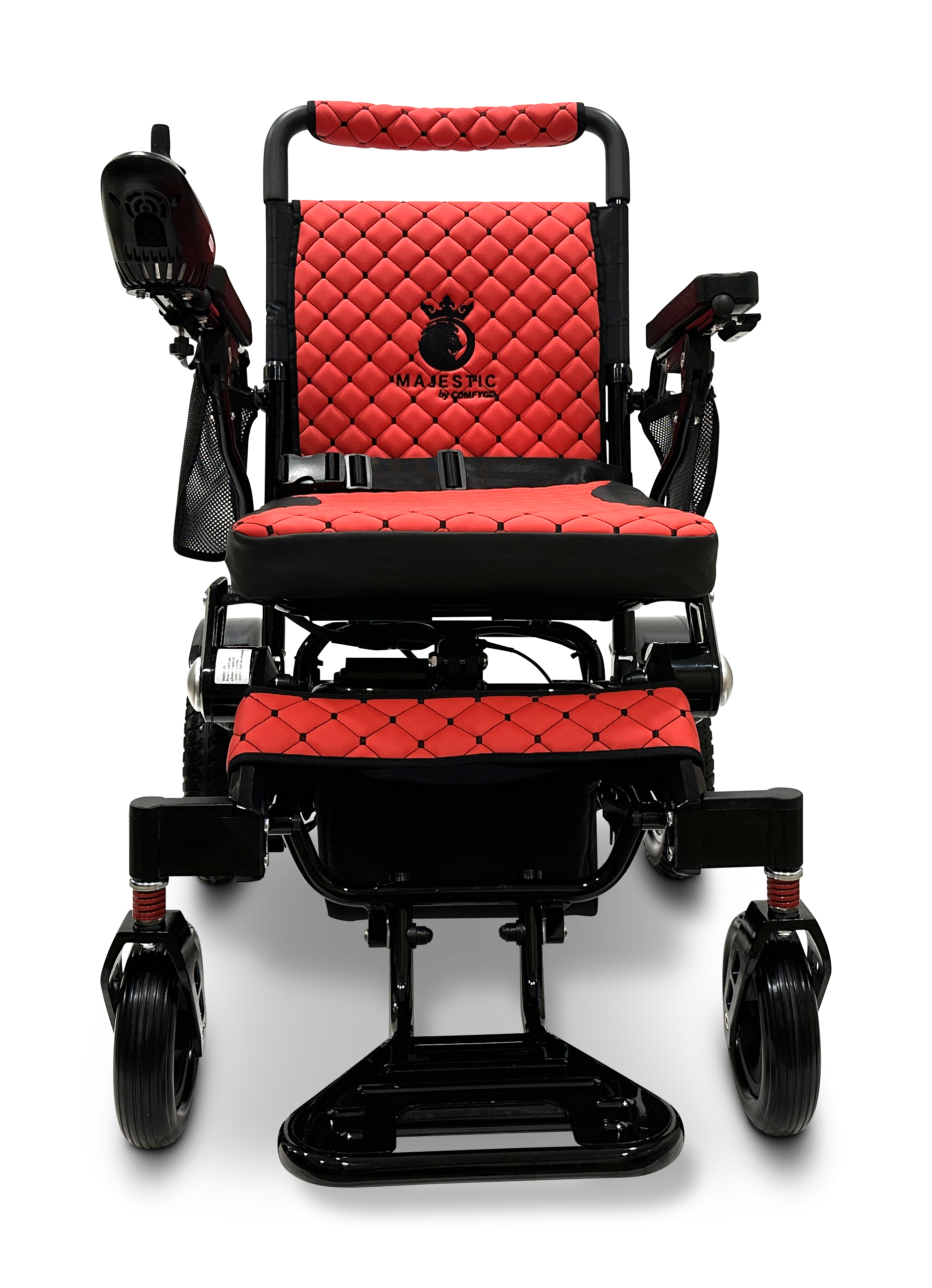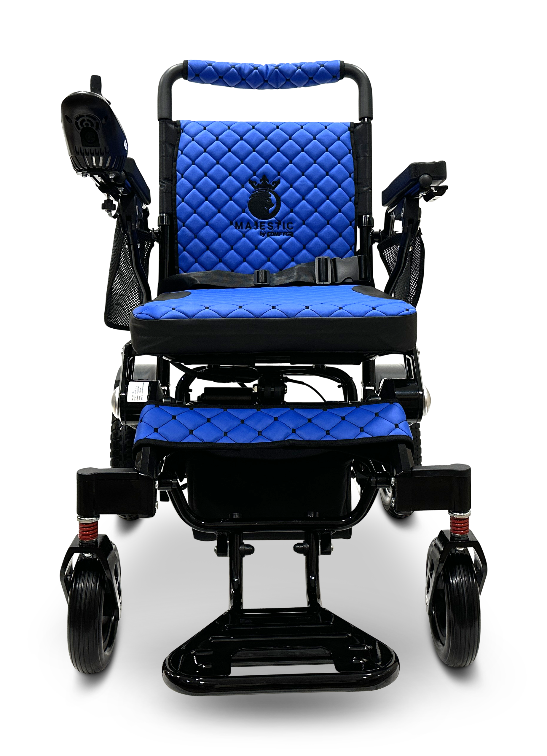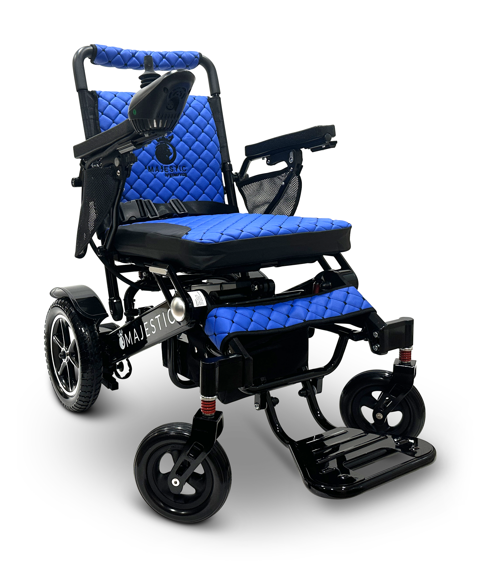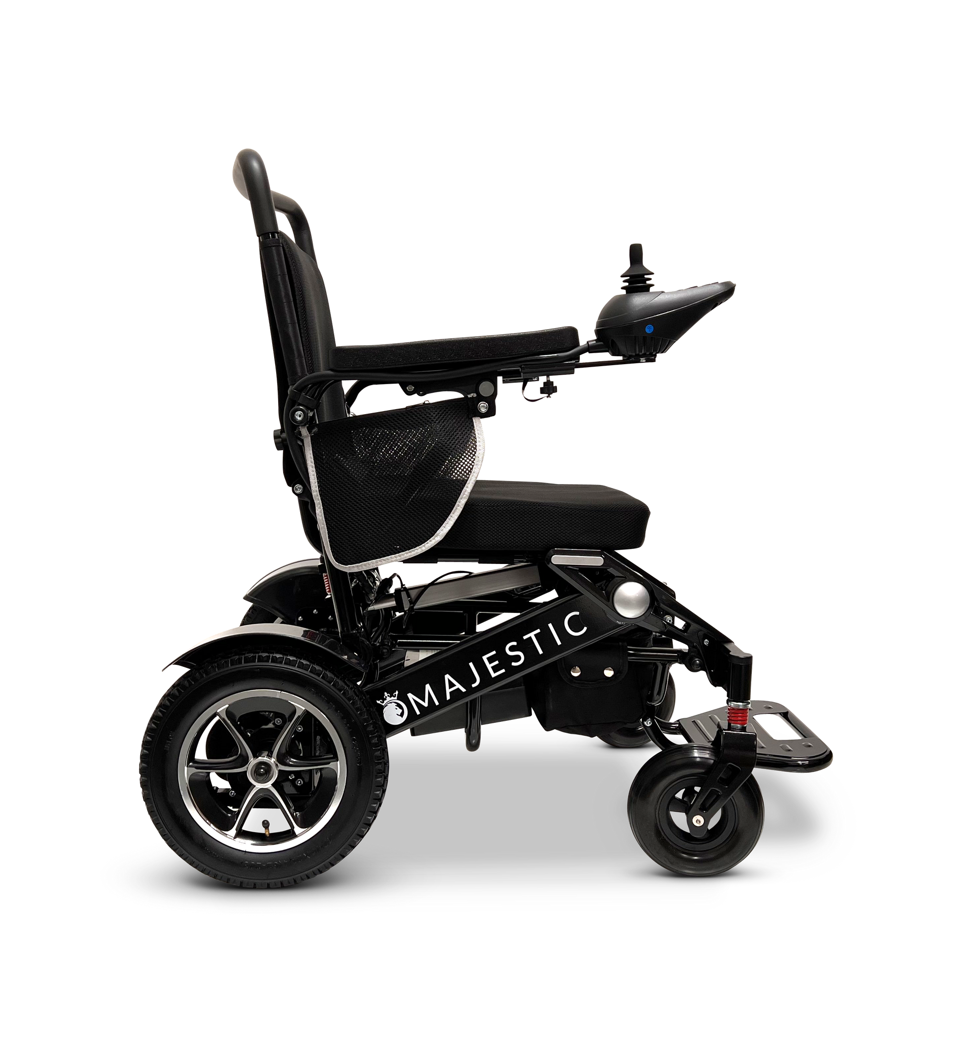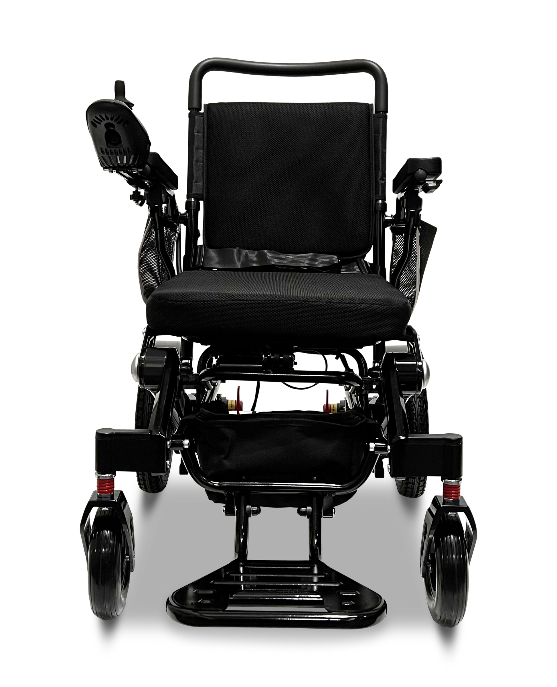 The IQ-7000 wheelchair is a beautifully designed folding electric wheelchair for travel. This transport motorized wheelchair is lightweight, airline friendly. This is a sturdy wheelchair and features a weight capacity limit of up to 350 lbs. with a top speed of 4 mph. The IQ-7000 is available in four frame colors with five optional cushion and backrest colors that allow you to customize the color of your wheelchair fully. It’s equipped with a 360-degree waterproof universal intelligent joystick for easy control. The intelligent joystick includes a power on/off button with a power indicator light, speed selection buttons, and a horn. The 12AH lithium-ion battery powers two 250W brushless DC motors that deliver a range of up to 13 miles. 20AH batteries gives up to 19 miles of range