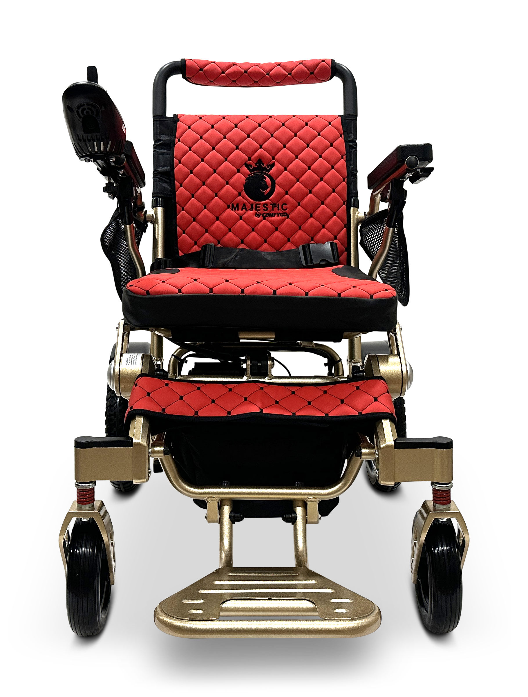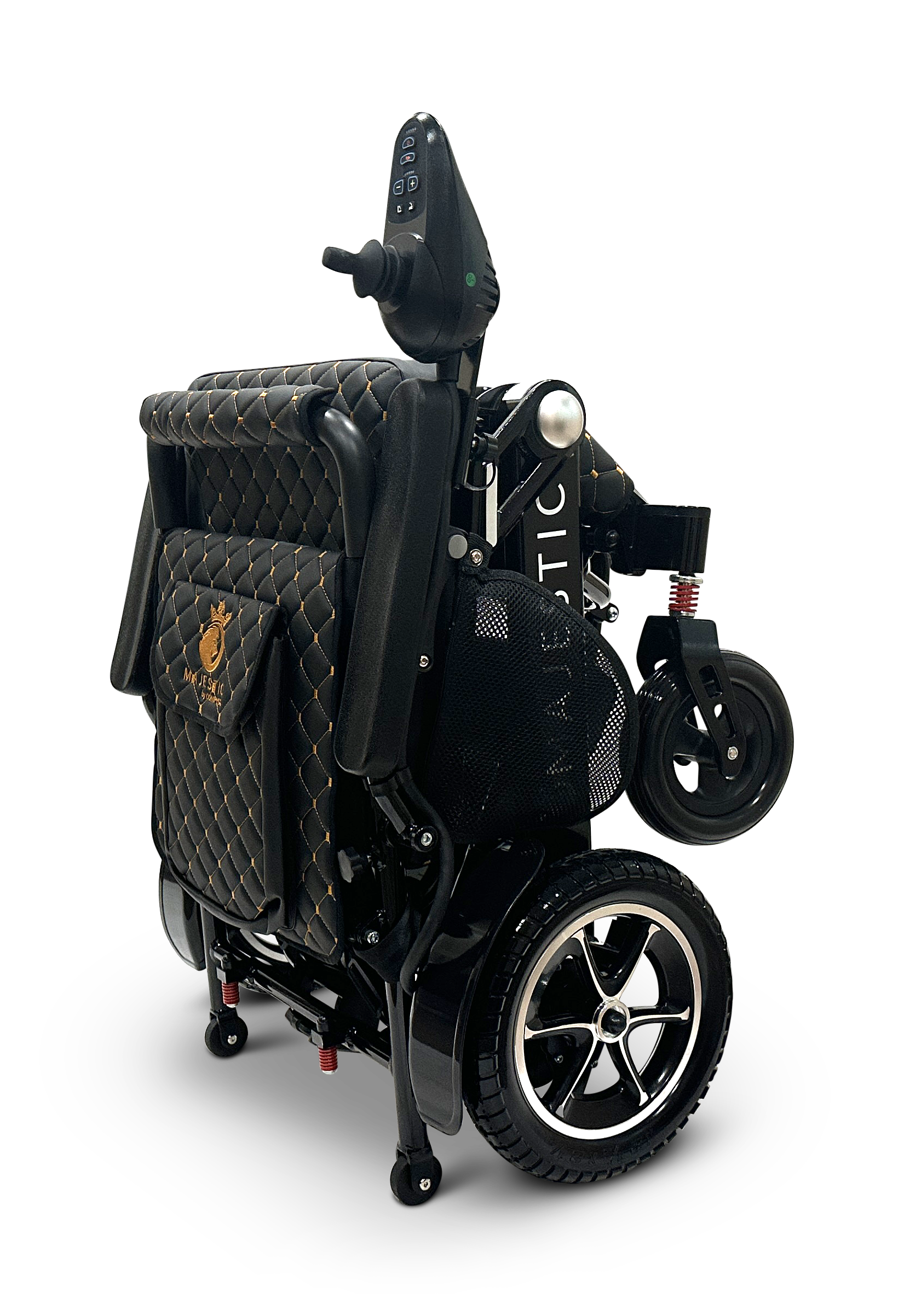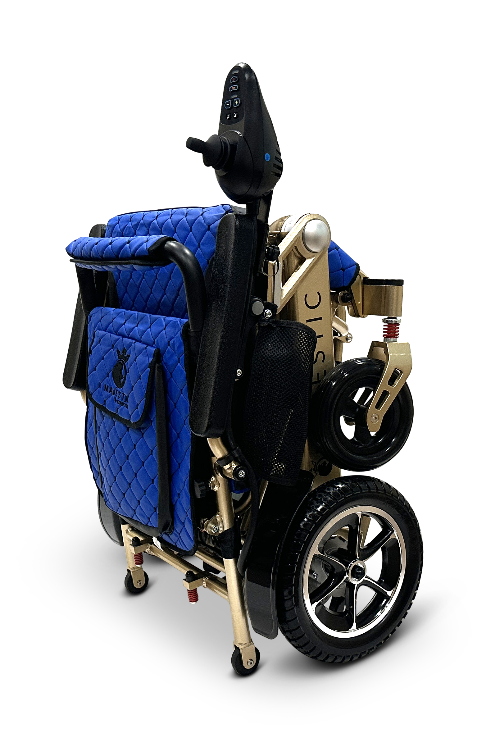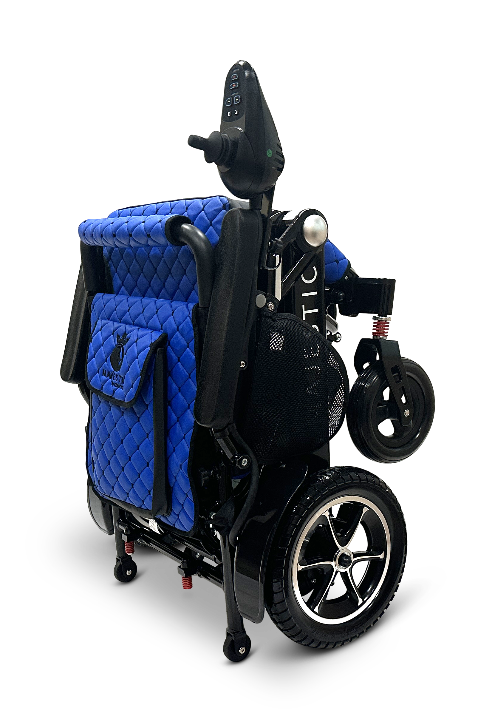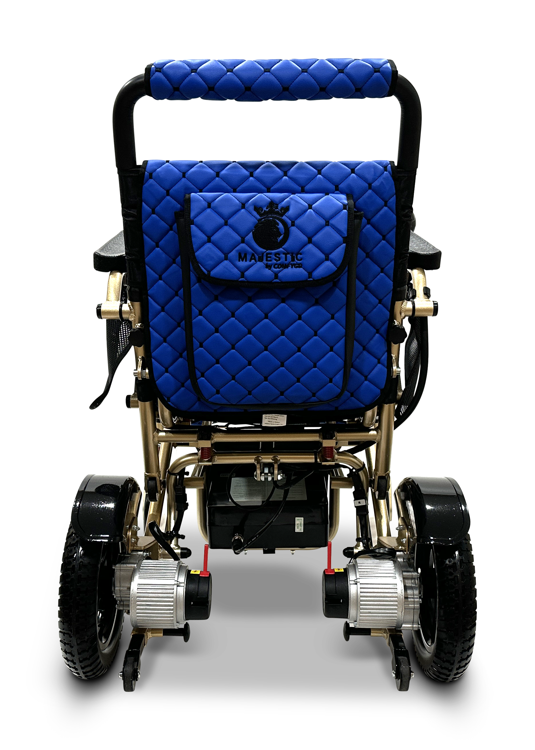 The IQ-7000 wheelchair is a beautifully designed folding electric wheelchair for travel. This transport motorized wheelchair is lightweight, airline friendly. This is a sturdy wheelchair and features a weight capacity limit of up to 350 lbs. with a top speed of 4 mph. The IQ-7000 is available in four frame colors with five optional cushion and backrest colors that allow you to customize the color of your wheelchair fully. It’s equipped with a 360-degree waterproof universal intelligent joystick for easy control. The intelligent joystick includes a power on/off button with a power indicator light, speed selection buttons, and a horn. The 12AH lithium-ion battery powers two 250W brushless DC motors that deliver a range of up to 13 miles. 20AH batteries gives up to 19 miles of range